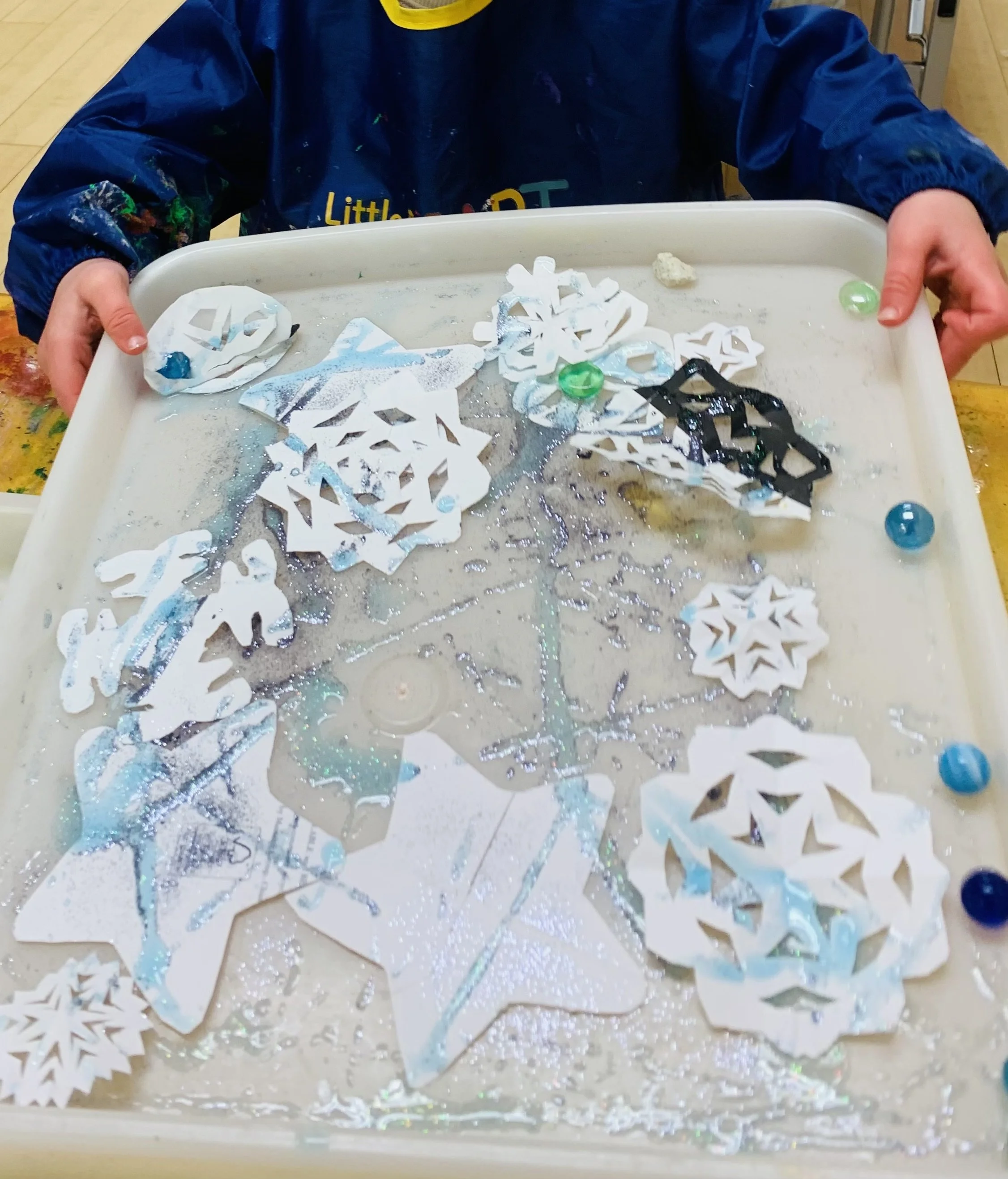 We look forward to seeing these sparkly paper stars and snowflakes hanging up in our room for our Holiday Party this Wednesday!