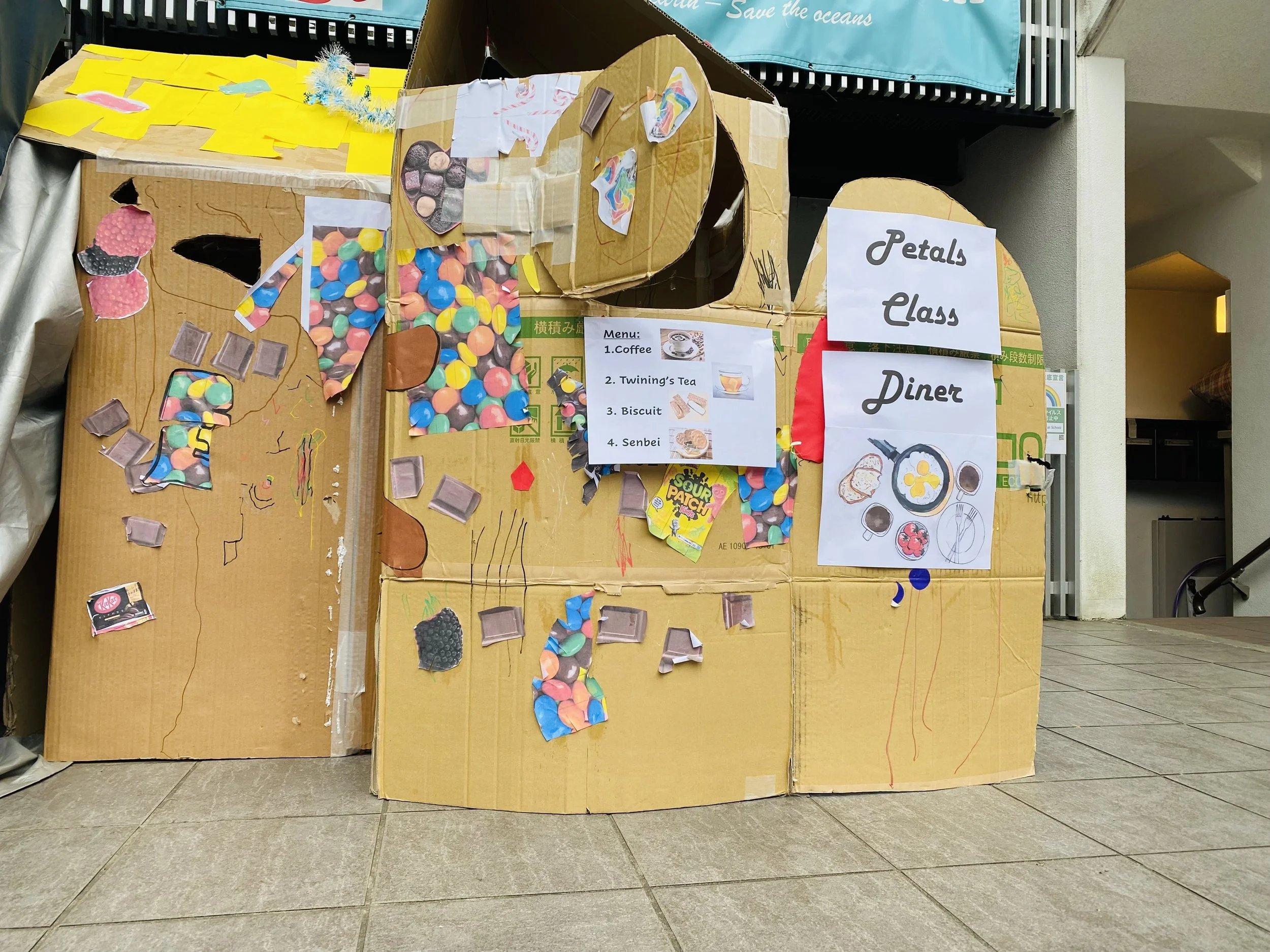Before our long vacation started, we discussed with Kai what we wanted on the menu. We decided on coffee, tea, cookies, and senbei, and we saw these laid out in trays and boxes inside our diner. When our daddy dropped us off, we asked what they wanted to have for breakfast, then filled to- go bags with their order. Kai took a picture of us with daddy with a Polaroid camera, and it was a nice little souvenir of our Dad’s celebration. We hope next year we can celebrate together in school, face- to- face!
