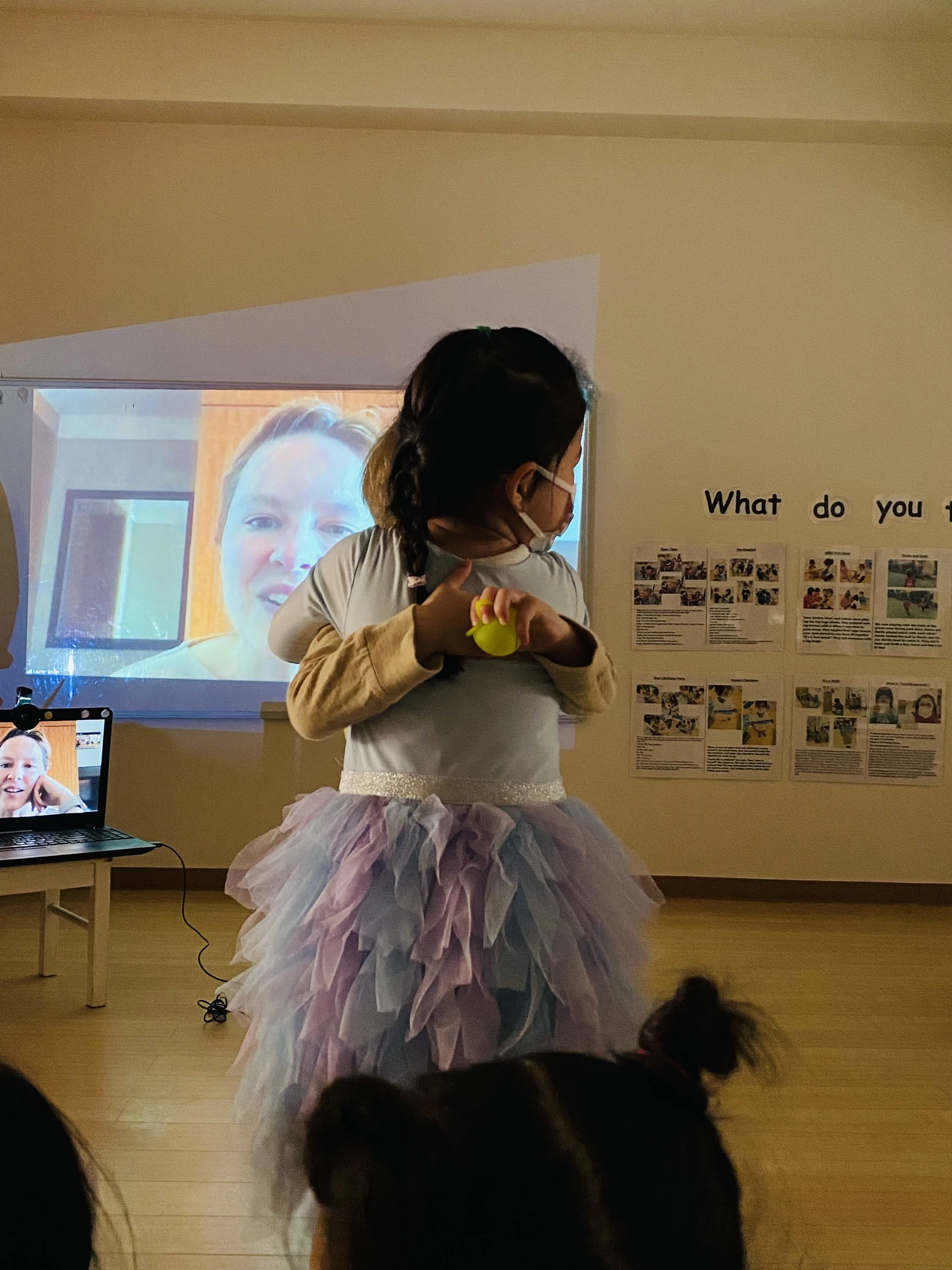 Before the special visitor came we noticed that there were two other teachers in the room. We sang our hello song and introduced ourselves to them. When we found out one of the teacher’s names we couldn’t believe it! His name is Oscar, too! We gave a big “What!?” But it’s ok to have two people with the same name. We still didn’t really believe it though. The other teacher was Debbie. We’ve seen her before but we haven’t formally introduced her to the class. After a quick introduction, it was time for our special visitor. It was Michael’s mom, Lauren! Lauren came to have a farewell party for Michael. She showed us Michael’s photos of his time in Japan and when he was a little toddler. Michael saw trains, drank strawberry champagne when on a clear kayak, caught his own fish for dinner and so much more during his time here. It looked like he had a lot of fun when he was in Japan! We wanted to tell him something as well. Hiori started by saying, “I’ll miss play together”. Some of us also wanted to say something as well: