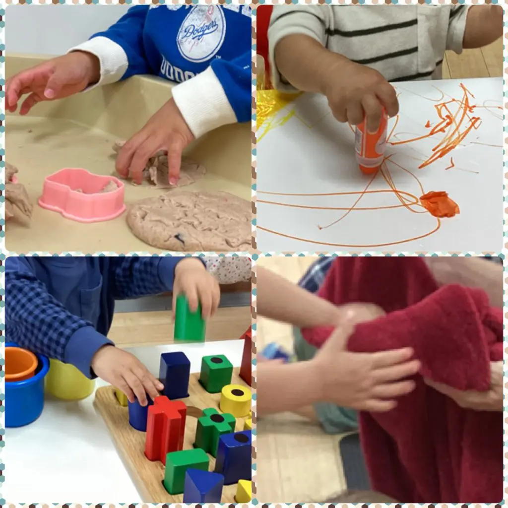 This morning, we sorted colorful shapes and cups by size and fit on the front table. H investigated the cups and tapped them on the table top! He seems like a natural drummer! K had loads of fun fitting the shapes to their correct spots, he even shared some pieces to his friend L who came over and gave him an orange and blue cup to hold the pieces. Thank you!