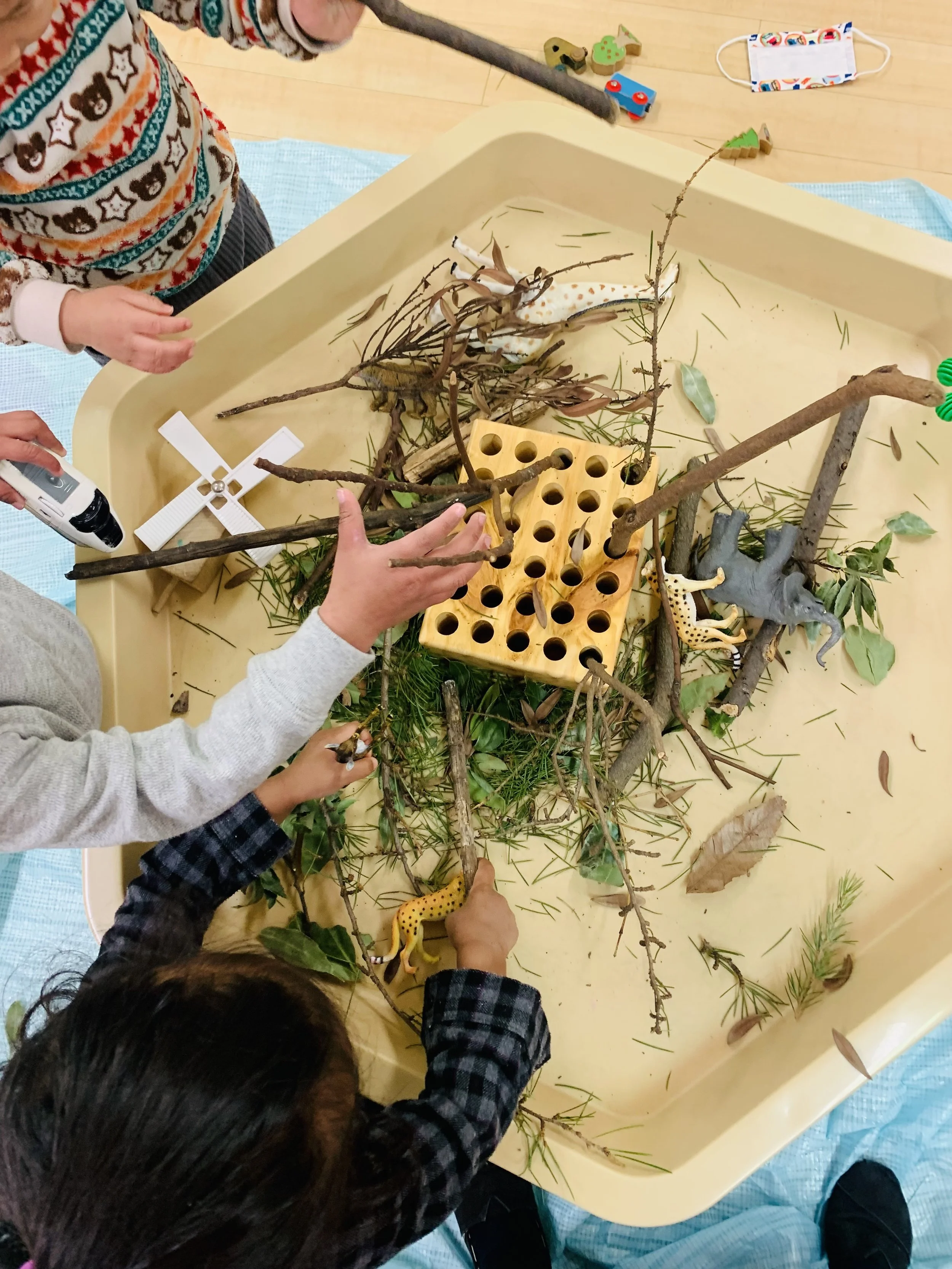 Today was round two of our “jungle” pretend play as we have more friends who came in today to share their ideas to add to our collaborative storytelling. Based on L’ idea of “hanging ” toy animals from branches, R, K and S also played with that idea and figured which of the animals could stay on top of the branches the longest. They had to take into consideration the animals’ size and weight. The outcome resembled the famous tree climbing goats in Morocco, Africa.