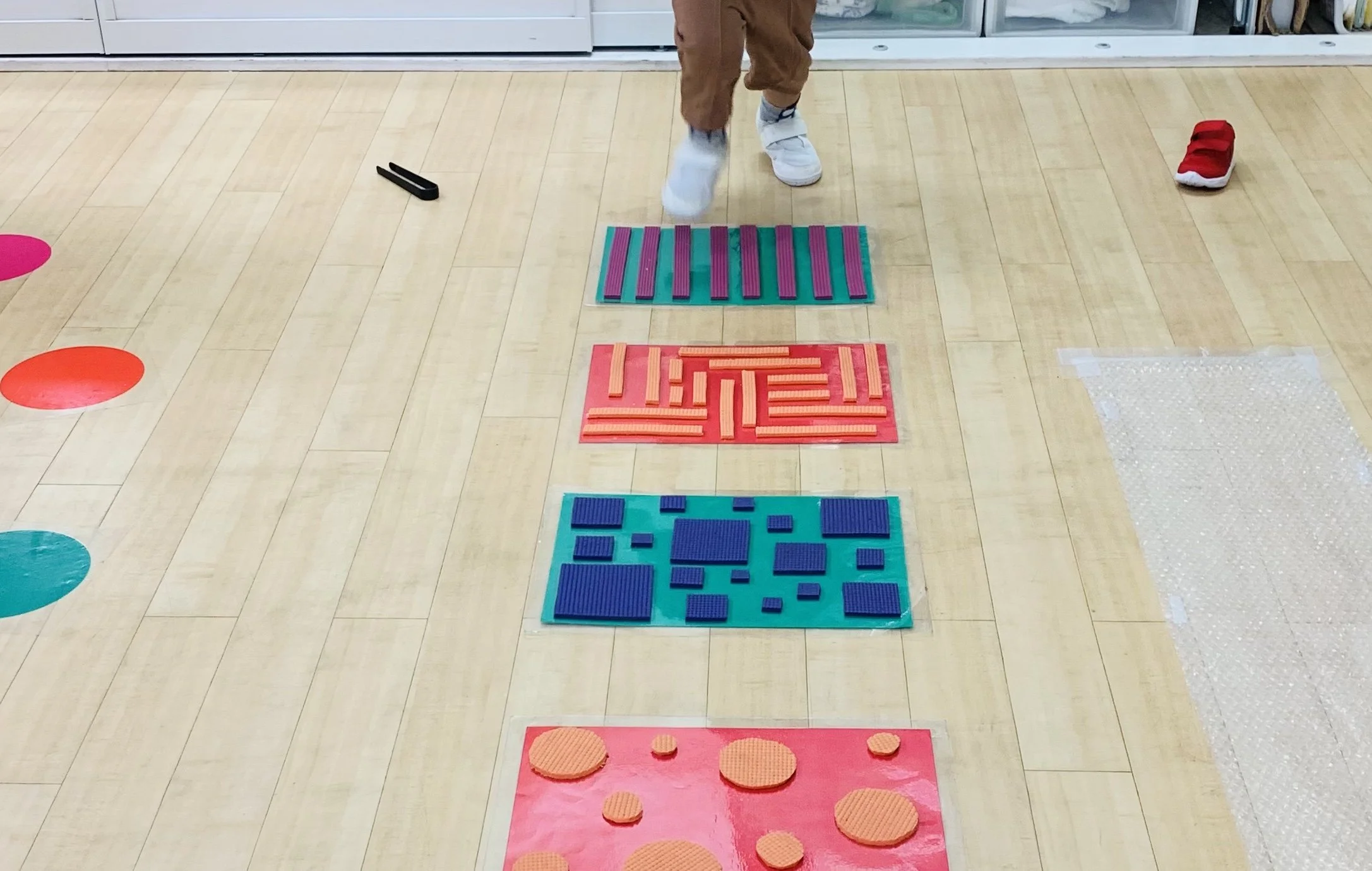 L and W thought of dashing through the mats with their fast feet! They stopped on their tracks upon noticing that running on bubble wrap made a sound whereas running on foam mats did not.