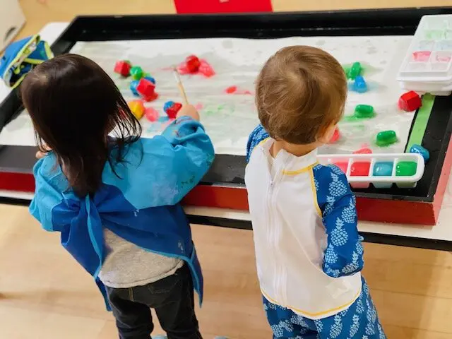 Some of us used brushes to keep the ice blocks moving around the tray. Of course, we touched and felt the ice with our hands. Some of us were hesitant to touch because we didn’t want the slimy, glittery glue to be on our hands. The inner part of the room was buzzing with the “Choo-choo!” sound as some of us made long trains and made move it around the room.