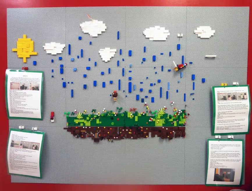 In my experience of working on vertical surfaces, I feel that there is also a huge social aspect to it. On our Lego wall, we created a garden together, working from the bottom up, making the earth, grass, flowers, clouds and some sky.