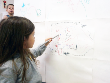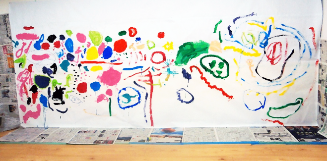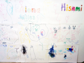 One of our teachers had another brilliant idea and turned a table on its side, covered it completely with paper and the children drew vertically. The children again, were inspired by one another’s drawings, which they could see clearly.