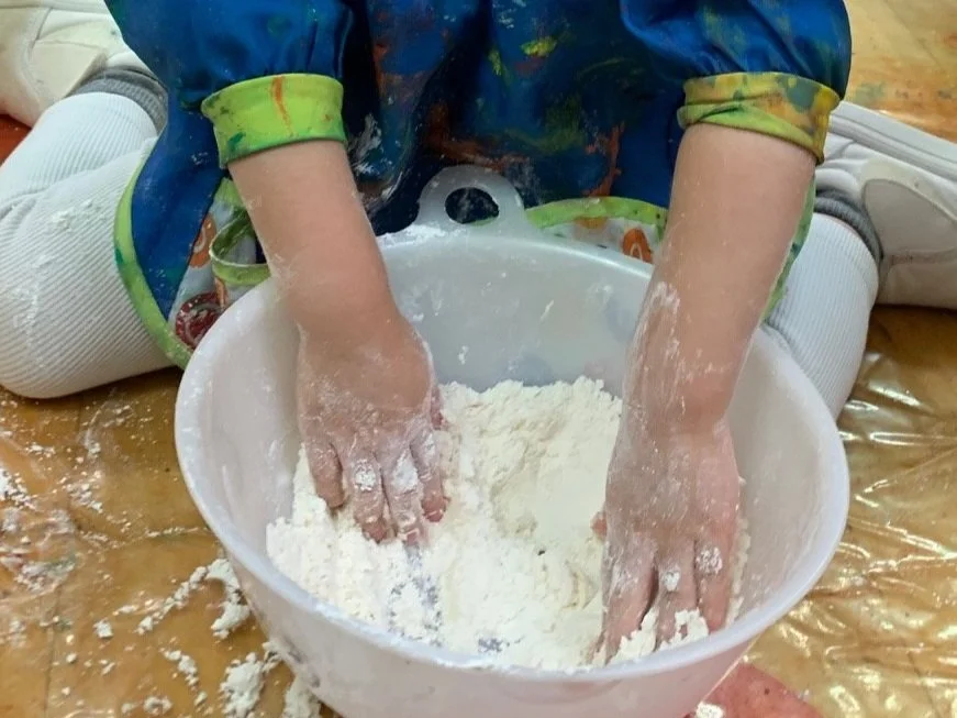 After we cleaned up everything we were playing with, we sat down together and had a circle time. Some of us already knew the routine and came to sit down as soon as they finished packing things away. J had a request and said “Baby Shark!!!” so we sang “Baby Shark” first while moving our hands. We also enjoyed singing “Wheels on the Bus” and “Clap Your Hands”. Moving hands and touching different parts of the body made us think about our body parts too. After these songs, Seila told us we would make something by using our hands today. We were wondering what we were going to make, the first thing Seila put in the bowl was…flour! We touched it to feel what it’s like. Some of us really liked that texture but some didn’t. Teachers added salt, oil and some squeeze of lemon juice(!) in the bowl. We still had no idea what we were making, but we were mixing all of them with our hands. At last, teachers added hot water and the thing we were making became… play dough! That was the perfect timing to wash our hands because it was time to eat our yummy yummy snacks.