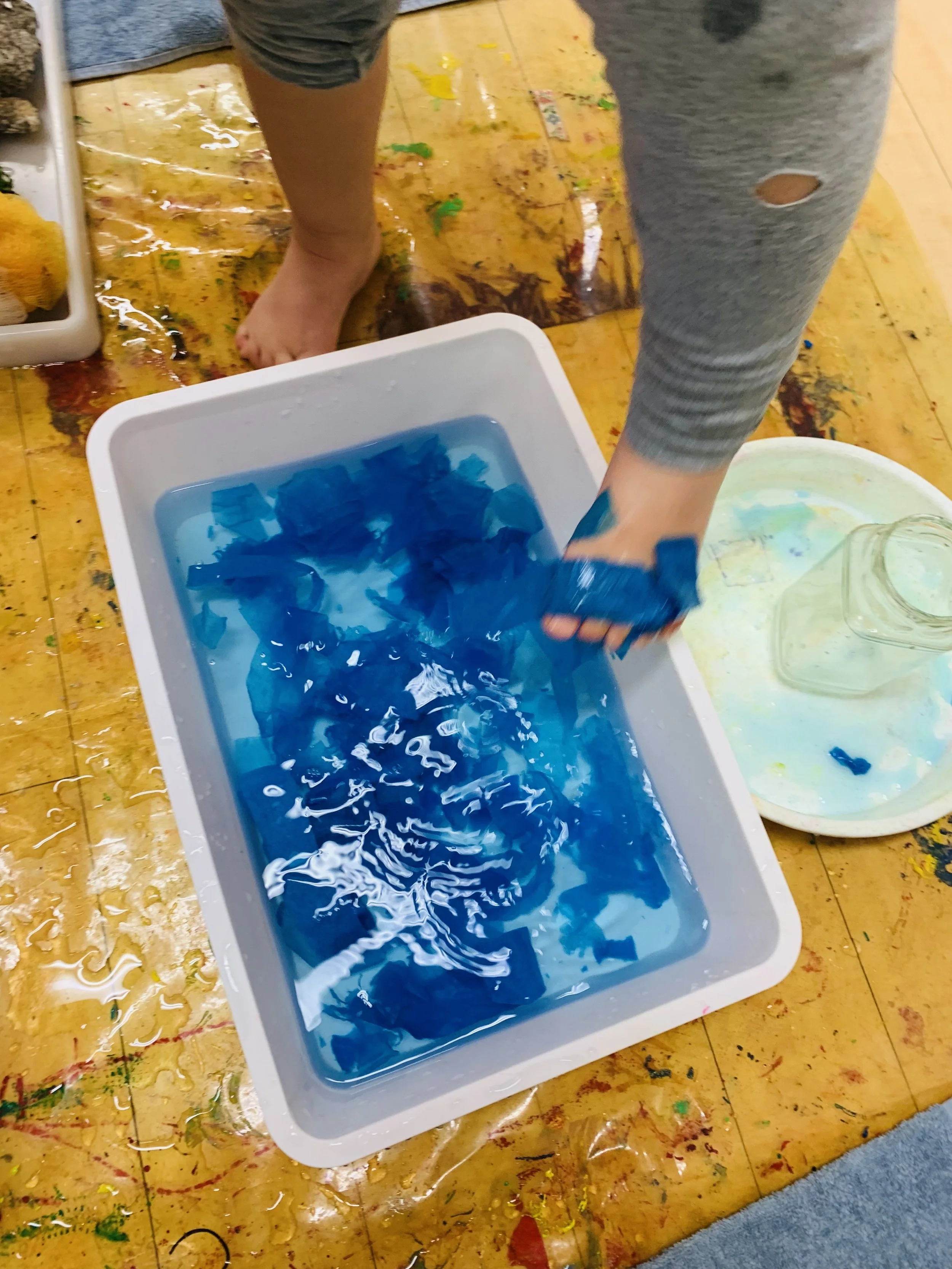 Three water tubs were laid out on the floor, each having a different purpose. One tub was for observing how watercolor would swirl with water, another was to observe which objects would sink & float, and the last one was to observe how crumpled colored tissue paper would expand when soaked in water.